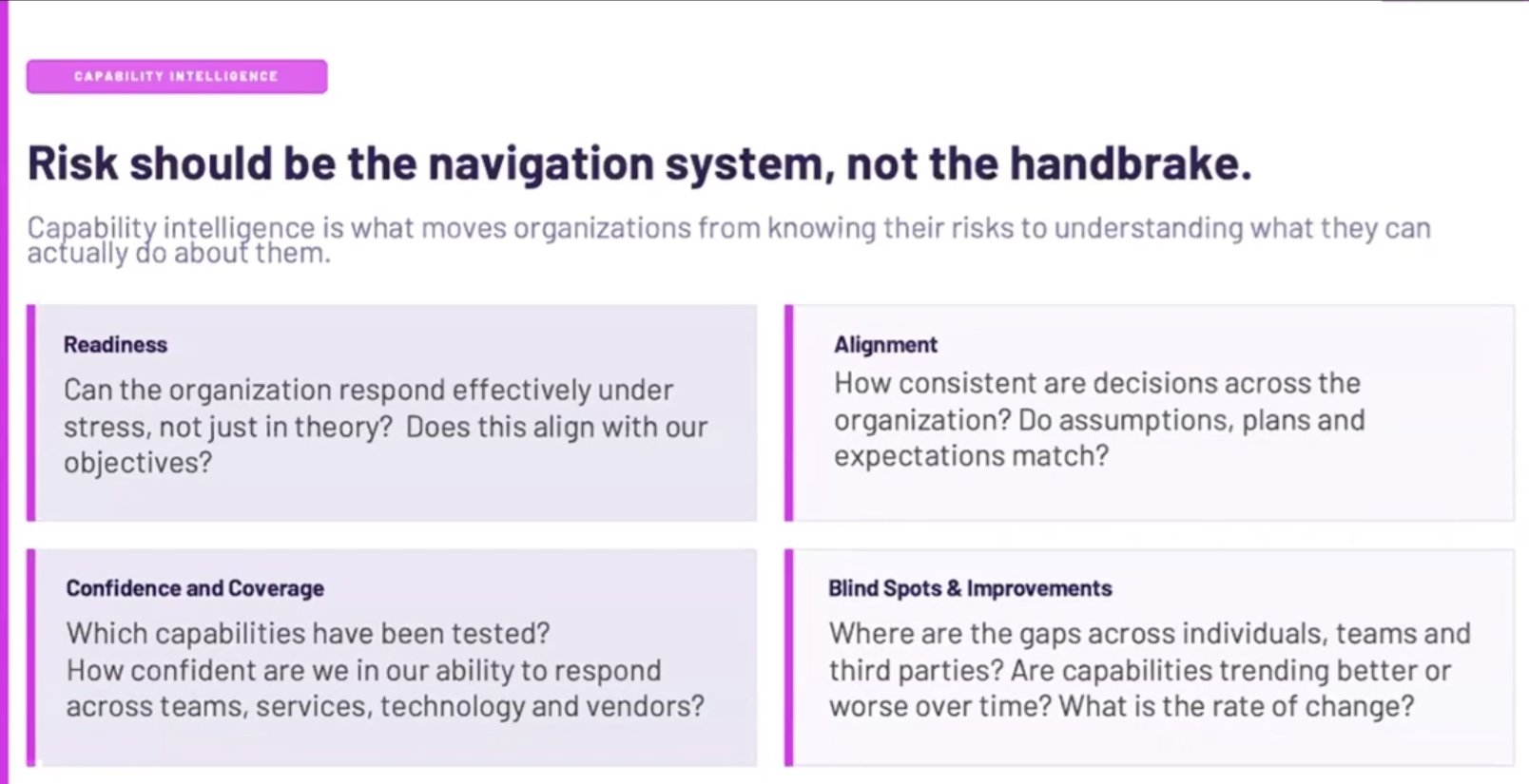 Risk intelligence tells you something about the world outside your organization. Capability intelligence tells you something about the organization itself. Specifically, whether it can actually respond when things go wrong.