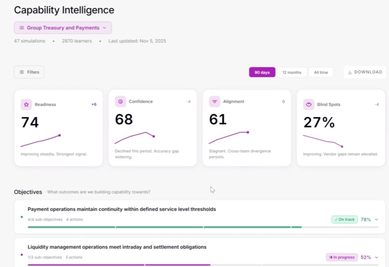 Over time, repeated simulations build a body of behavioural intelligence that's difficult to obtain any other way. They surface whether decision authorities are understood or just assumed, where escalation breaks down, where people are working from assumptions that don't match organizational reality and equally, where capability is strong.