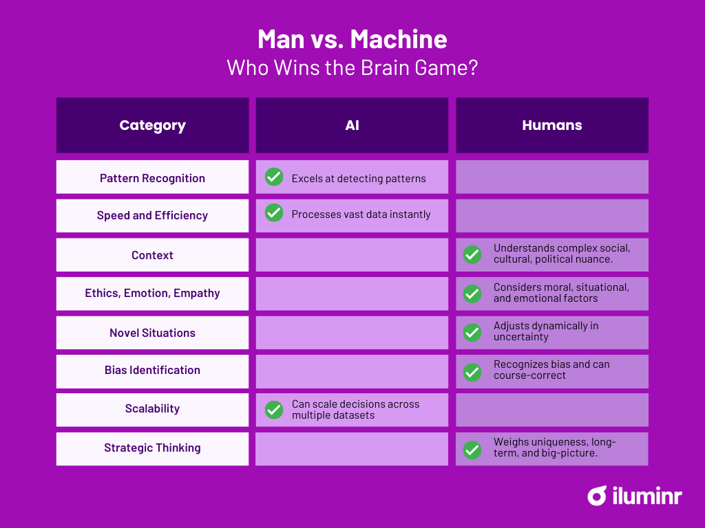 AI may be fast and data-driven, but human oversight remains critical for ethics, intuition, and strategic judgment.